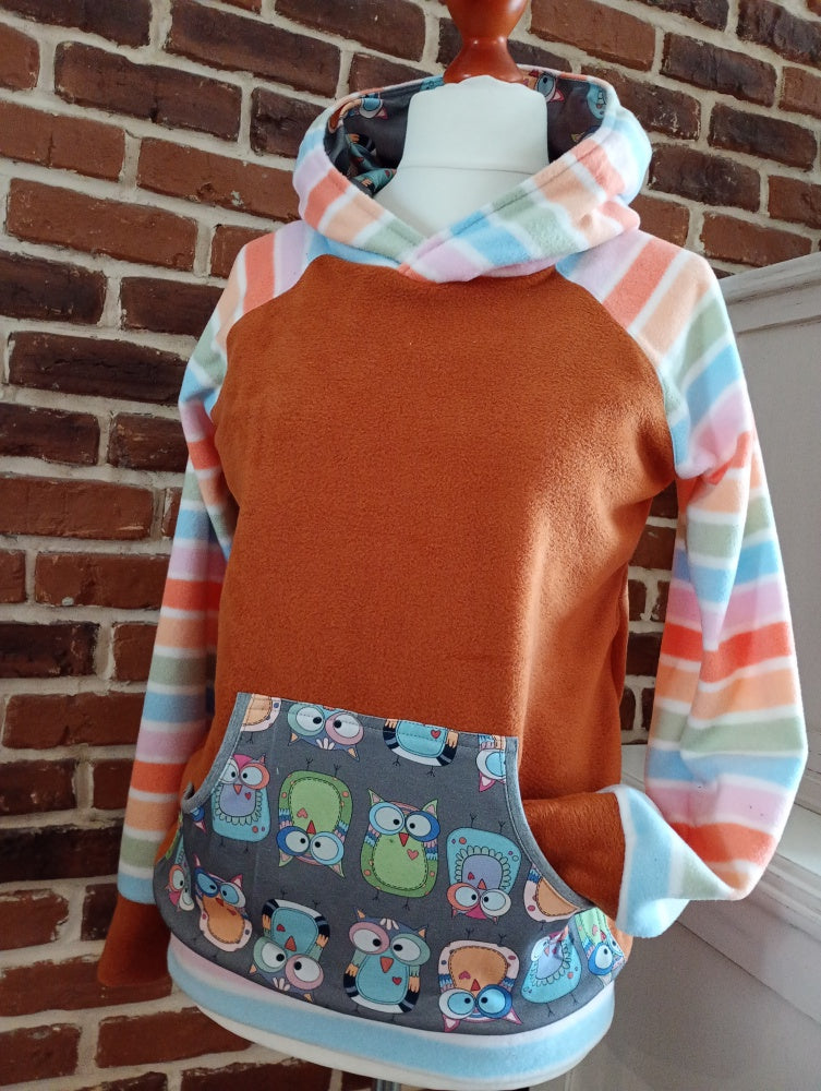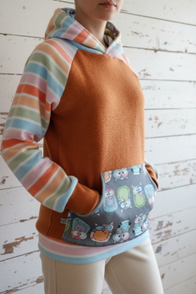 An der Känguruhtasche und in der Kapuze ist ein Sweatstoff mit unserem eigendesign Stoff.
