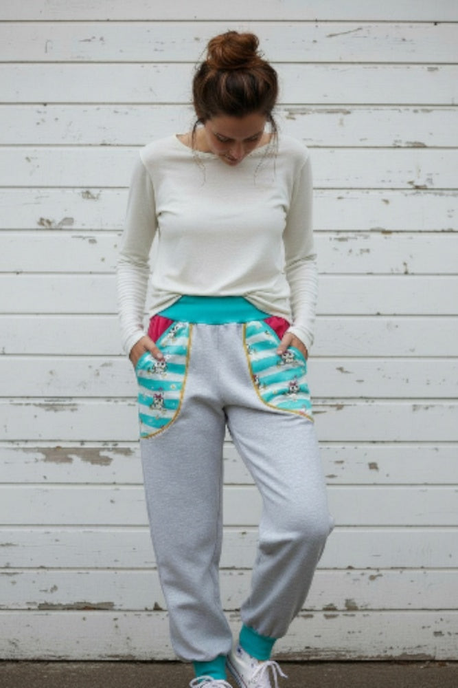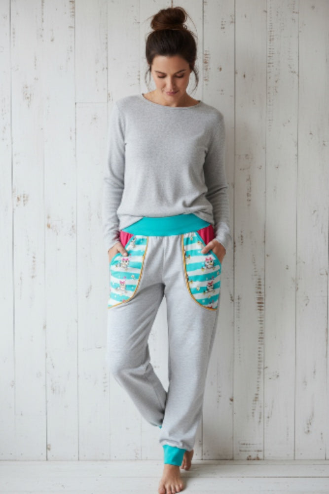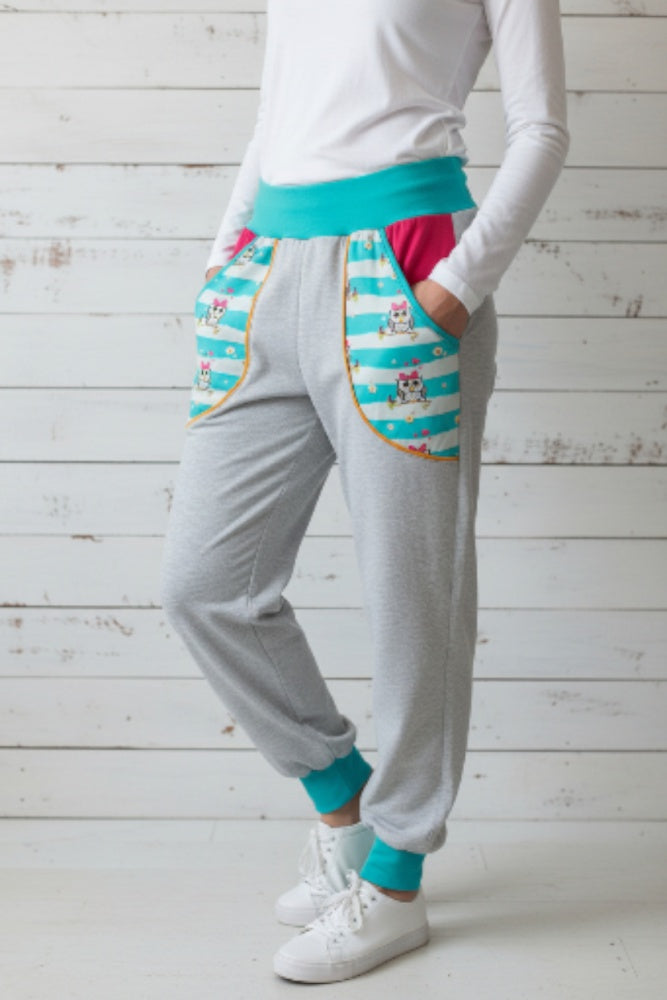 Eine Pumphose aus Baumwolljersey in grau, mit lustigen Eulen an den Taschen hinten und vorne.