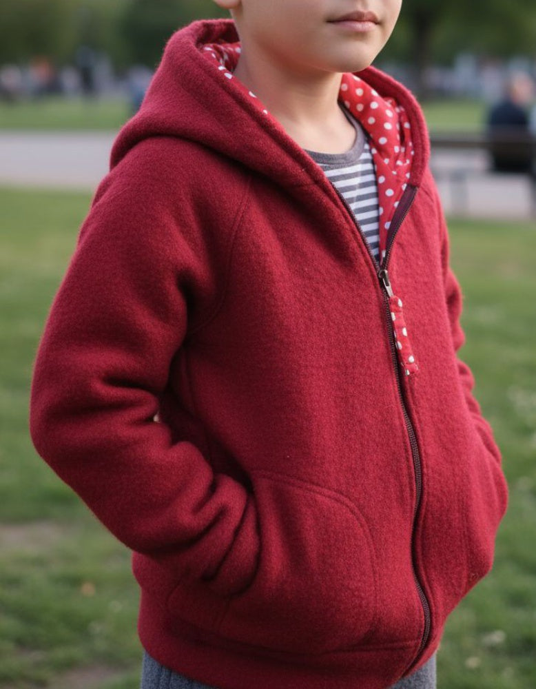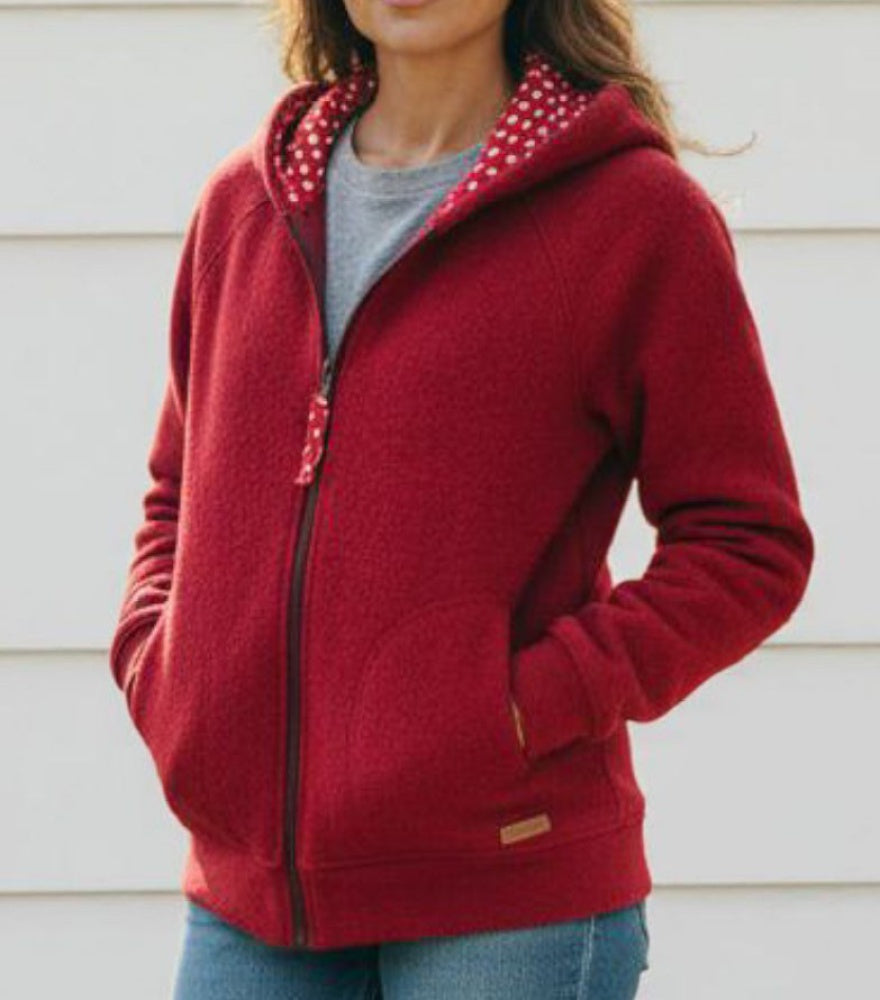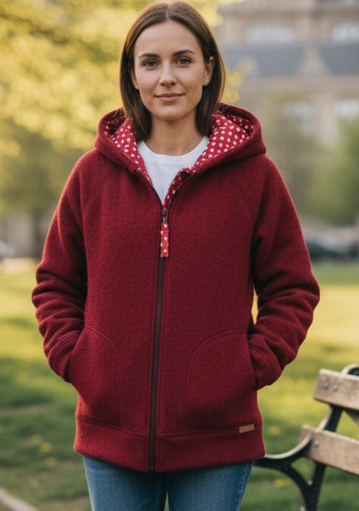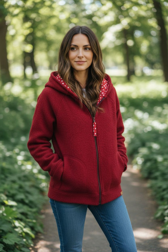 Schöne Walkjacke aus 100% Wolle in rot. Die Walkjacke kommt ohne oder mit Innenfutter. Die Jacke hat ein Baumwoll Futter in rot mit weißen Punkten.